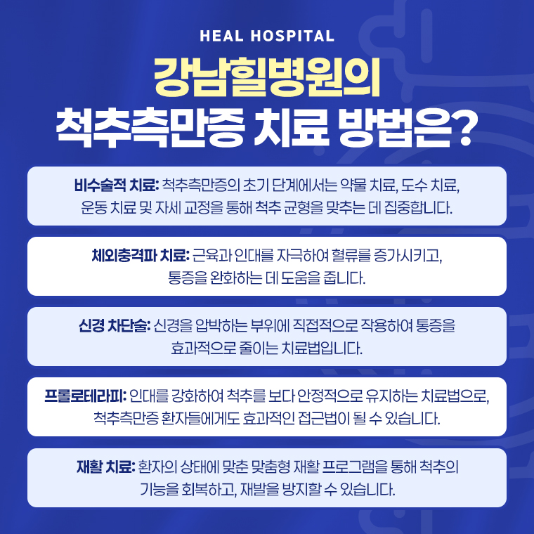 강남힐병원은 여러 가지 비수술 치료법으로 척추 건강을 도와드립니다. 초기 단계의 측만증 환자에게는 구디통증의학과 약물, 도수, 운동 치료와 함께 자세 교정으로 척추 균형을 바로잡는데 중점을 두고 있답니다. 체외충격파는 근육과 인대를 자극해서 혈류를 증가시키며 통증을 줄이는데 효과와 신경차단술은 신경 눌리는 부위에 작용해 통증을 직접적으로 감소시킬 수 있는데요. 프롤로테라피는 약해진 인대 강화와 척추 안정성을 높여볼 치료로 척추측만증 환자에게도 적용한답니다.